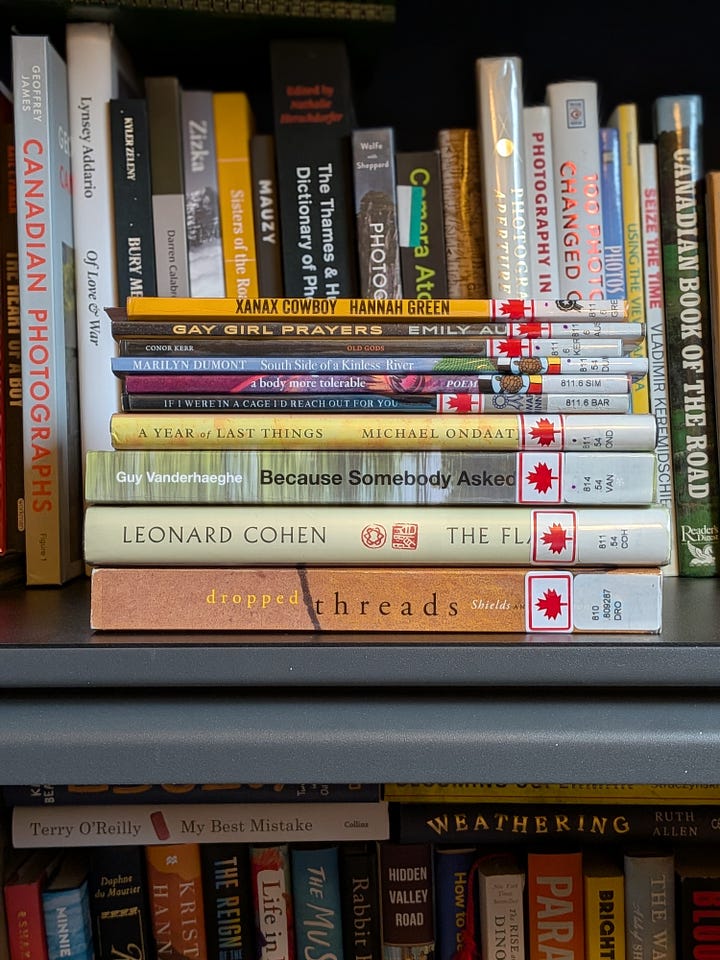 I love poetry, I love writing it (not well) and I revel in the poems of Mary Oliver, Robert Frost, and Emily Dickinson. But again, I thought, where are all my Canadian writers?
